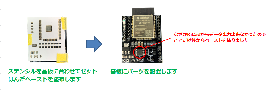 【不定期連載】【電子工作&プログラミング】タミヤ ワイルドミニ四駆 ラジコン化計画⑤ 2022年11月25日 タミヤ ワイルドミニ四駆 0 コメント 【基板設計ミスってました。。。】 発注していた基板が届きました。今回は、基板にESP32-WROOM-32Eと、DCモータドライバなどの電子部品をリフローします。 1枚の基板に3×2で6枚です。手で折れるので簡単に切り離せます。 早速、テスターで配線をチェックしてみます。 配線されていない所がありました。。。 基板を修正して、もう一度発注します(泣)仕方がないので、修正した基板が届くまでは、ジャンパーを飛ばして使っていきます。 気を取り直して。。。基板にこれらのパーツをリフローします。基板にはモータードライバが2個実装できるように設計しましたが、今回は後輪駆動ですので、1個だけ実装します。 基板に、はんだペーストを塗布しますので、塗布用のステンシルデータをKiCadで作ります。ステンシルは、基板と一緒に発注できるのですが、費用が抑えられるので自作します。 KiCadで作ったデータをもとに、今回、はんだペーストを塗る箇所だけレーザーカッターでカットします。ステンシルにはレーザープリンター対応の耐水紙を使っています。 ステンシルを基板に合わせてセットしたら、はんだペーストを塗布し、パーツを配置します。 加熱プレートではんだを溶かしてパーツを実装します。Aliexpressで520円くらいで購入しました。結構重宝しています。 基板にパーツを実装して、通電していなかった所にジャンパーを飛ばしました。 ヘッドライトも配線しました。 基板と、今回は6Vの電池ターミナルを搭載しました。電源電圧はこのまま6Vで行くか、9Vにするか。。。まだ思案中です。 次回は、PS3コントローラーから制御する仕組みを作っていきます。 前回記事 次回記事 投稿ナビゲーション 前 前の投稿: 【不定期連載】【電子工作&プログラミング】タミヤ ワイルドミニ四駆 ラジコン化計画④次 次の投稿: 【不定期連載】【電子工作&プログラミング】タミヤ ワイルドミニ四駆 ラジコン化計画⑥ コメントを残す コメントをキャンセルメールアドレスが公開されることはありません。 ※ が付いている欄は必須項目ですコメント ※ 名前 ※ メール ※ サイト 次回のコメントで使用するためブラウザーに自分の名前、メールアドレス、サイトを保存する。