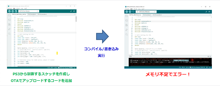 【不定期連載】【電子工作&プログラミング】タミヤ ワイルドミニ四駆 ラジコン化計画⑥ 2023年3月2日 タミヤ ワイルドミニ四駆 0 コメント 【PS3ワイヤレスコントローラーから制御する】 今回はPS3ワイヤレスコントローラーから制御する仕組みを、基板に書き込み動かしてみます。ヘッドライトもコントローラーでON/OFF出来るようにします。 それでは、基板にPS3ワイヤレスコントローラーから制御するスケッチを書き込みます。書き込み用のUSBシリアル変換を搭載していないので、Wi-Fi経由のアップロード機能OTA(Over the Air)を試しますが… なんということでしょう。。。フラッシュメモリを最大の16MBでコンパイルしたのですが、メモリ不足でエラーになってしまいました(泣) 仕方がないので、ESP-WROOM-32用書込・テストボードを使って書き込みました。「ESP-WROOM-32モジュール用 Walfront テストバーンフィクスチャ 小型バッチバーンフィクスチャ 最小システム 開発ボード 電子部品」長い名前ですね。。。 ESP-WROOM-32シリーズのモジュールをハメて、スケッチの書込みやテストができます。はんだ付けなしでプログラムの書き込みができ、ESP32のすべての端子に接続できるので、デバイスの試作に最適ですね。USB-Serial変換にはCP2104が使われていて、Arduino IDEで使用できます。 ESP-WROOM-32Eにスケッチを書き込んでから、基板に各部品をリフローし、コネクタも付けました。 ミニ四駆に基板を搭載し、モーター類やLEDライトを接続しました。 前回記事 投稿ナビゲーション 前 前の投稿: 【不定期連載】【電子工作&プログラミング】タミヤ ワイルドミニ四駆 ラジコン化計画⑤次 次の投稿: 【LED&銅箔テープ】光るハロウィンカードを作ってみた コメントを残す コメントをキャンセルメールアドレスが公開されることはありません。 ※ が付いている欄は必須項目ですコメント ※ 名前 ※ メール ※ サイト 次回のコメントで使用するためブラウザーに自分の名前、メールアドレス、サイトを保存する。