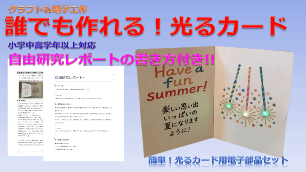 簡単に回路を作ってLEDを光らせるキットをご紹介します。銅箔テープという電流を流すテープを、紙にペタペタ貼るだけで回路が作れるので、回路に触れるきっかけとしておススメです。キットには、LED基板やスイッチ基板、銅箔テープ、回路図、ペーパーなどの必要なものがセットになっています。夏休みの自由研究や、ワークショップなどにご活用いただけます。 クラフト&電子工作 簡単!光るカード用電子部品セット(小学生中高学年以上) 銅箔テープで回路を作り、LED基板、スイッチ基板、コイン電池ホルダーを使って、光るBOXカードを作れるキットです。夏休みの自由研究やプレゼント作りにもぴったりです。 詳細 ご購入 BOXカードキット(花火) 銅箔テープで回路を作り、LED基板、スイッチ基板を使って、光るBOXカードを作れるキットです。BOX右側面のスライドスイッチをONすると、背景の花火が青、赤、黄、緑色にランダムに点灯します。現在、スイッチサイエンス様でも販売中です。 詳細 ご購入 シェーカーキット(星に願いを) 銅箔テープで回路を作り、LED基板、スイッチ基板を使って、光るシェーカーを作れるキットです。下のハートを押している間、星が白色に点灯します。現在、スイッチサイエンス様でも販売中です。 詳細 ご購入 期間限定 タグキット(クリスマスツリー) SOLD OUT 銅箔テープで回路を作り、LED基板、スイッチ基板を使って、光るクリスマスタグを作れるキットです。タグ左下のプレゼントを押している間、クリスマスツリーの星飾りが青、赤、黄、緑色にランダムに点灯します。 詳細 ご購入 【限定商品】シェーカーキット(春よ来い) SOLD OUT シェーカーキット(星に願いを)の春バージョンです。ハートを押している間、花びらが赤色に点灯します。季節限定で、在庫がなくなり次第終了させていただきます。 詳細 ご購入